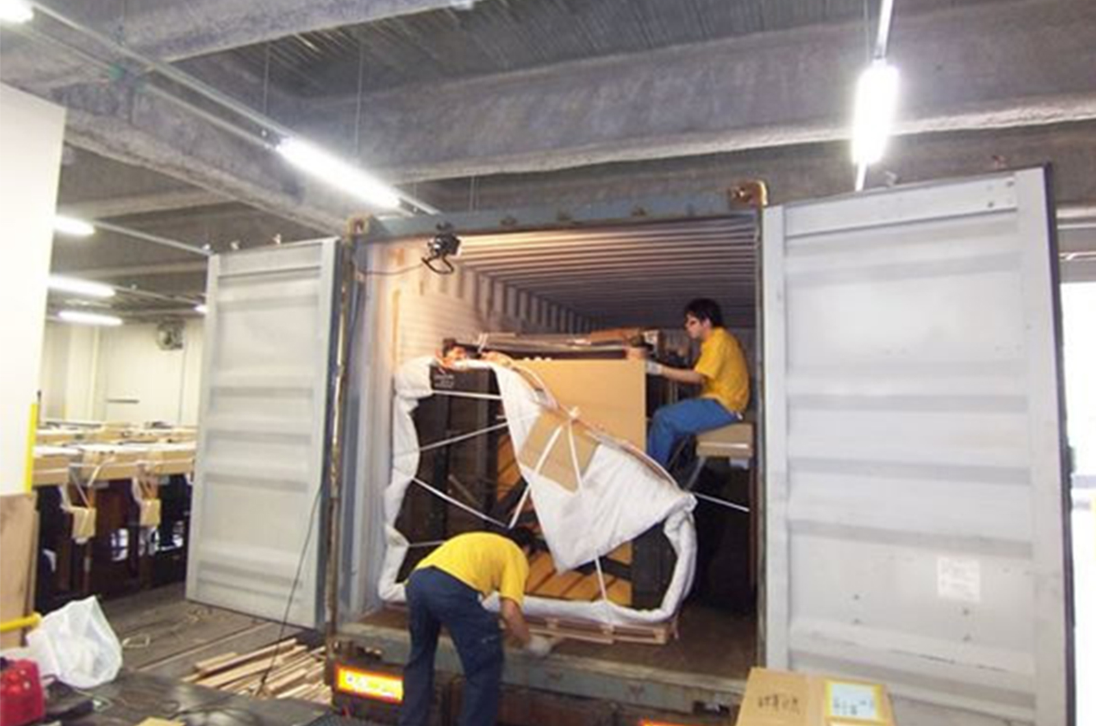 Once the preparations for export are complete, the pianos are carefully packed into shipping containers and sent out. The work at the Logistics Center includes the careful loading of the pianos entrusted to us.